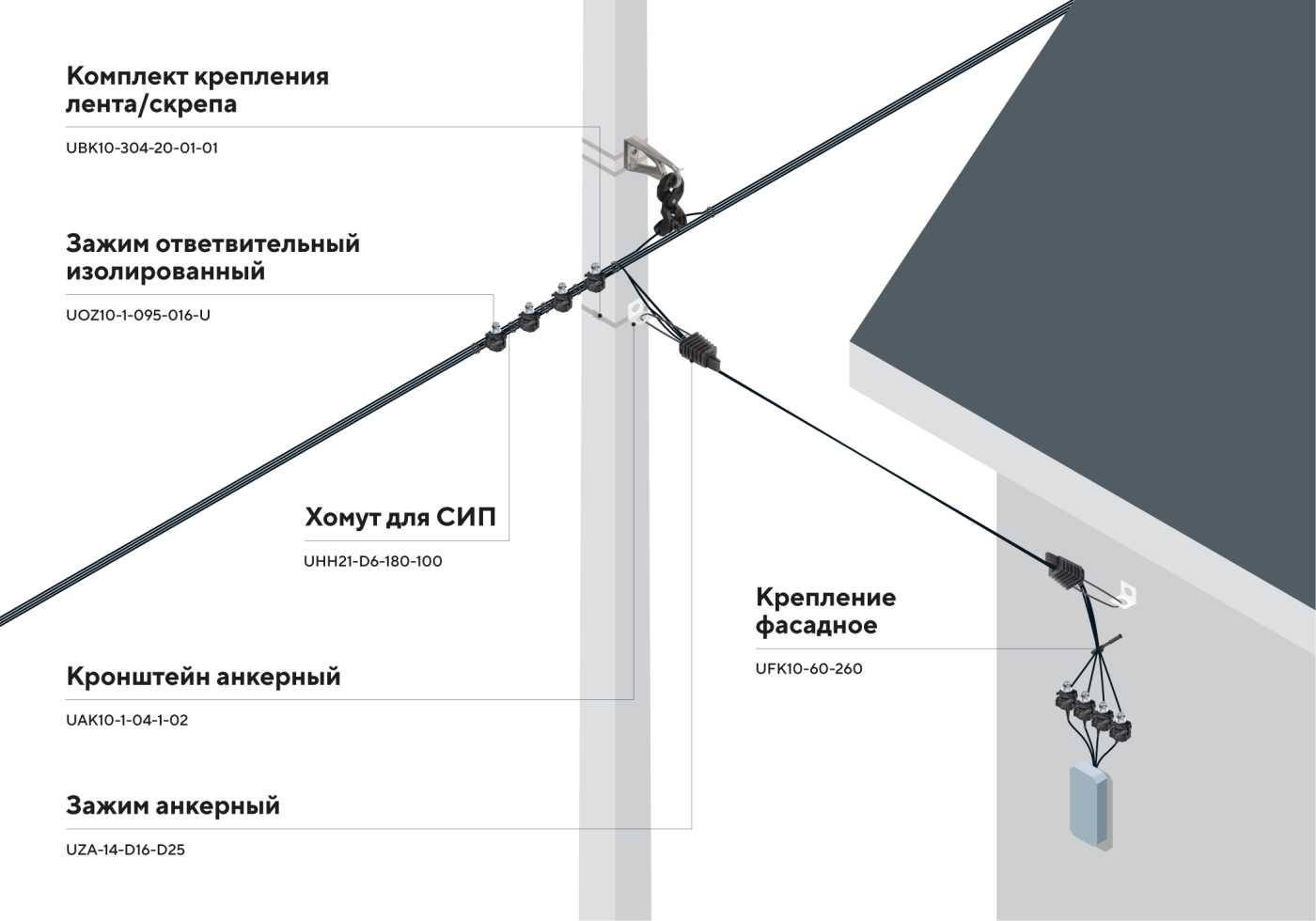 - Крепление фасадное ФК 60 (SF-60) (1 шт.) – дюбель с хомутом для безопасного монтажа СИП на фасаде (отступ 60 мм от стены, согласно нормам пожарной безопасности).
